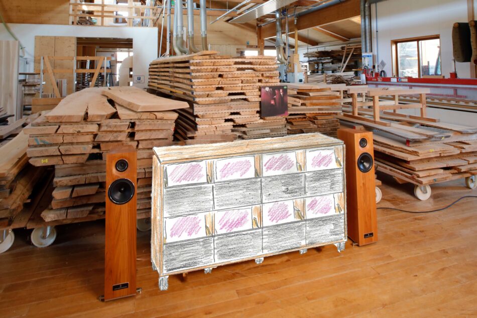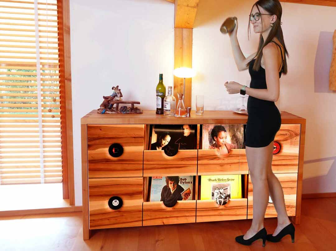 Weil sich ein Kunde einen Schallplattenschrank mit massivem 4 cm Rahmen gewünscht hat, haben wir eine Fotomontage desselben aus dem ÜBRIGEN Sideboard in Kirschbaum und dem Plattenschrank erstellt.