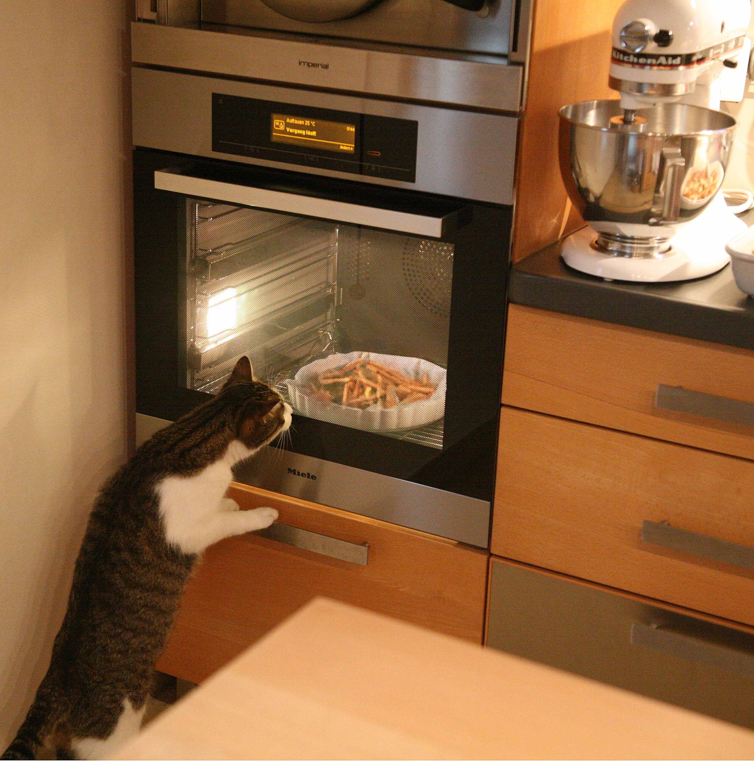 In den Backofen passt aber sehr viel mehr rein, er ist sowieso da und blockiert als zusätzliches Gerät nicht die Arbeitsplatte und es gibt speziell dafür gelochte Bleche und Einlagen. Sie können das gerne bei uns ausprobieren, hier sind auch noch ein paar Hinweise von Miele und vertrauen sie unserer Gourmetkatze, sie ist auch aus Frankreich.