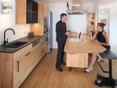 Auf dem Weg nach Düsseldorf haben wir in Moers den allerersten höhenverstellbaren Konferenztisch mit unsichtbarem Induktionskochfeld fotografiert und ausprobiert. 4 Meter lang, 350 Kilogramm schwer, aber eine echte Freude, wenn der Gastgeber von Müller-Moers während der Konferenz auf einmal das Kochen anfängt. Natürlich könnte man so eine raffinierte Lösung auch als Kochinsel in allen Größen herstellen. Hier sind noch viele Details zum Tisch und höhenverstellbare Alternativen.