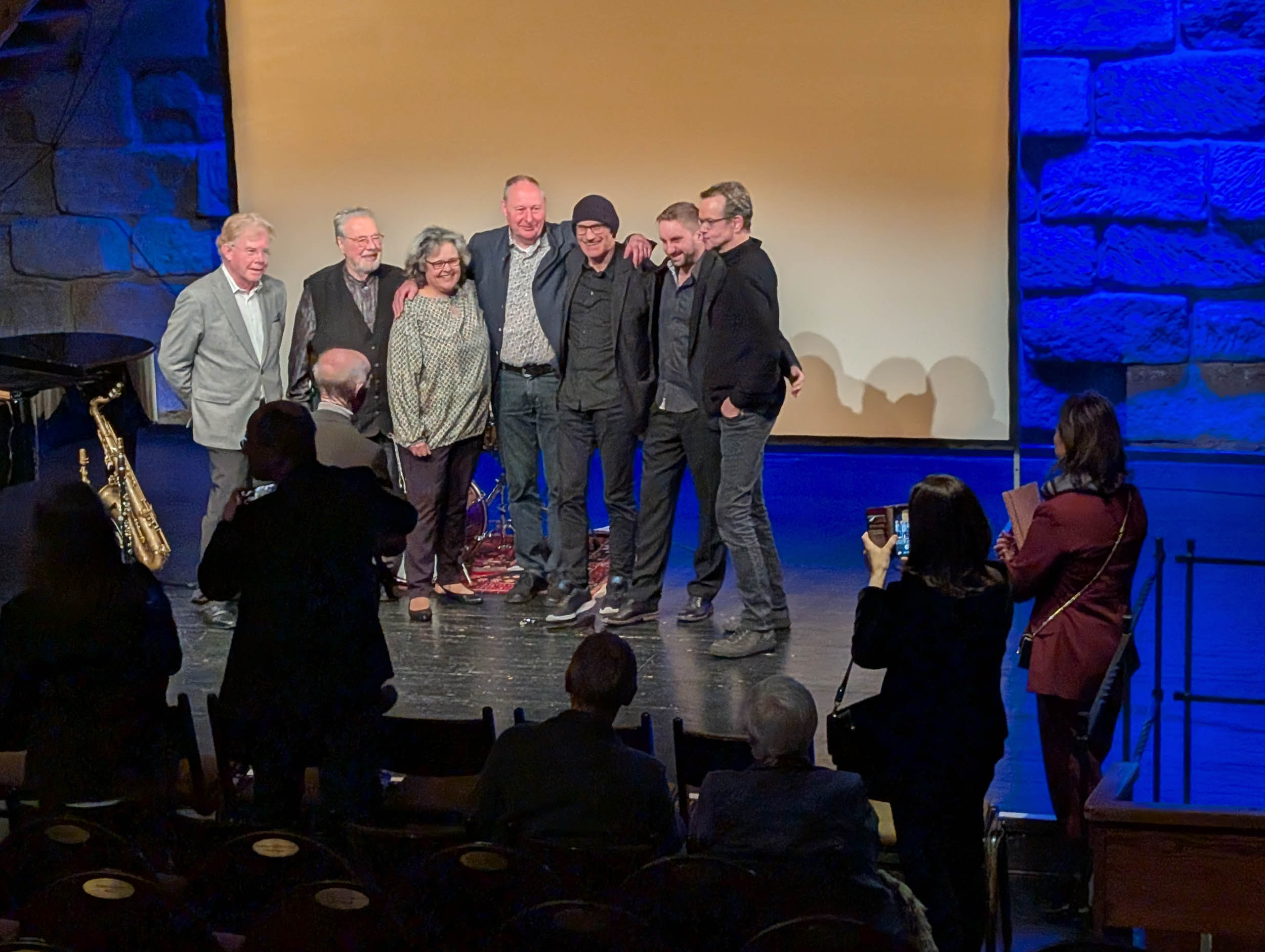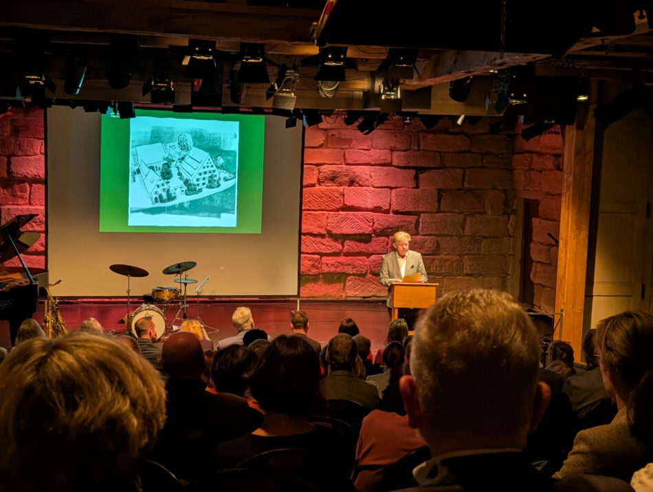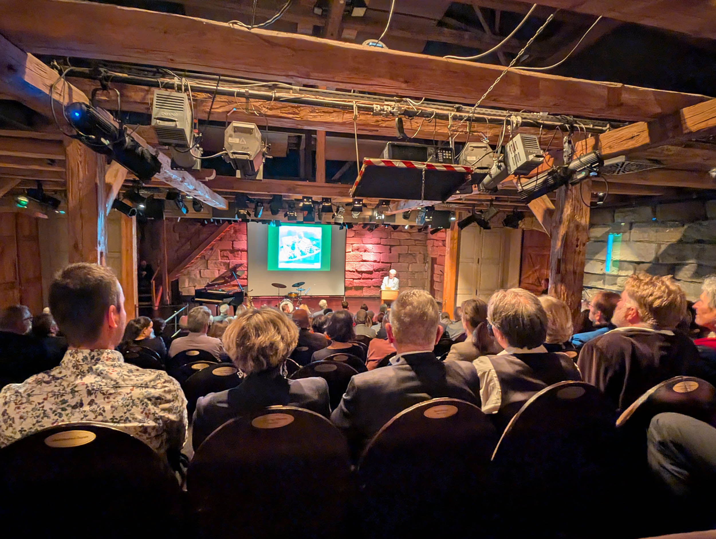 Im Theater meisterte Ralf Weiß dann die Kunst, 50 Jahre auf 20 Minuten Erzählungen mit Fotos einzudampfen. Die fantastische Musik zwischen allen Grußworten und der Festrede kam von Norbert Nagel (Klarinette), Jo Barnikel (Piano) und Julian Fau (Schlagzeug). Sie war ein wesentlicher Teil des genialen Abends. Dazu kamen die Anekdoten, die Norbert einfließen ließ: Er konnte sich schon als ganz junger Mann für das einladende Wesen Wolfgang Riedelbauchs begeistern und ist ihm für diese – in der offiziellen Musikszene damals seltene – Offenheit bis heute dankbar.