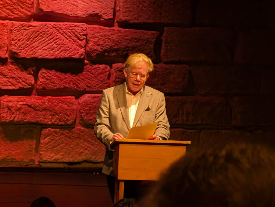 Es war zweifelsohne der Höhepunkt des Abends, als Marcus Everding Goethes Kutscher mal kurz in Dehnberg vorbeifahren ließ – den jungen Leuten sei hier erklärt, dass es damals weder Navigationssysteme noch Funktelefone gab. Die weiter unten nachlesbare schriftliche Version kann der vorgetragenen nicht das Wasser reichen, aber wir können sie auf diesem Weg wenigstens der Nachwelt erhalten. Hier ist ein kleiner Ausschnitt im Video: