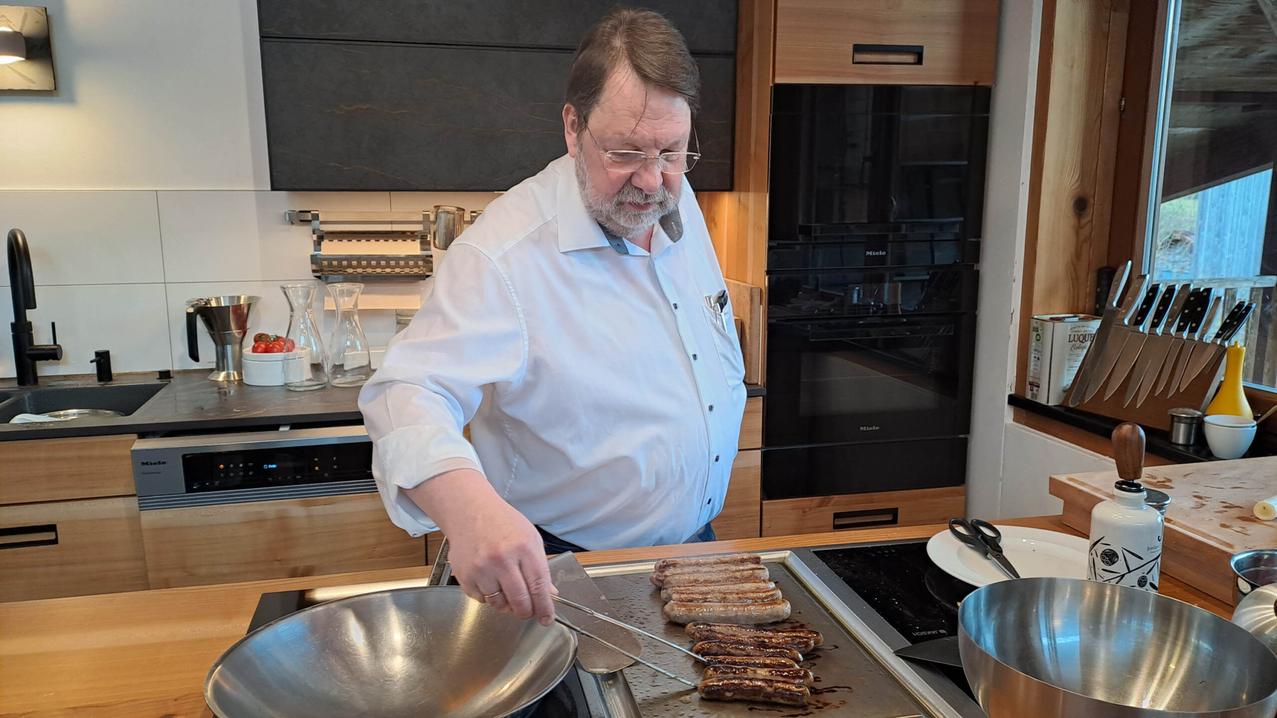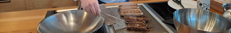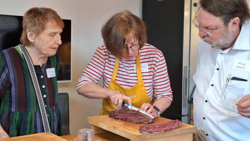 Natürlich haben alle Gäste in ihrem Leben schon tausende von Zwiebeln geschnitten, und trotzdem freuen sich viele, die handwerkliche Methode zu lernen. Das fängt schon mit dem Halbieren und beim Schälen dem Dranlassen des Strunks an und mit dem scharfen Messer und der richtigen Schneidtechnik muss man dann auch nicht weinen.