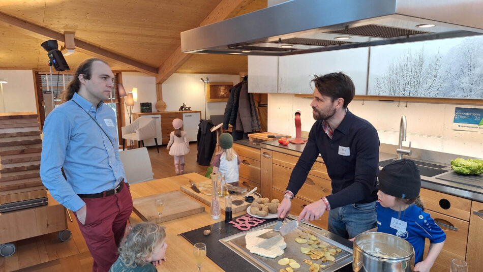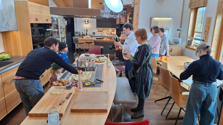 Unsere höhenverstellbare Küche kann für Rollstuhlfahrerinnen oder – wie bei diesem Kochworkshop – für Kinder auf 75 cm heruntergefahren werden, was schon Kindern ab dreieinhalb Jahren ermöglicht, auf dem Tepan Yaki braten zu können. Wir sind immernoch die einzigen, die eine Kochinsel (und auch die Spülenzeile!) auf 75 cm herunter und auf 120 hochfahren können und dabei auch noch alle Möbel mitnehmen.
