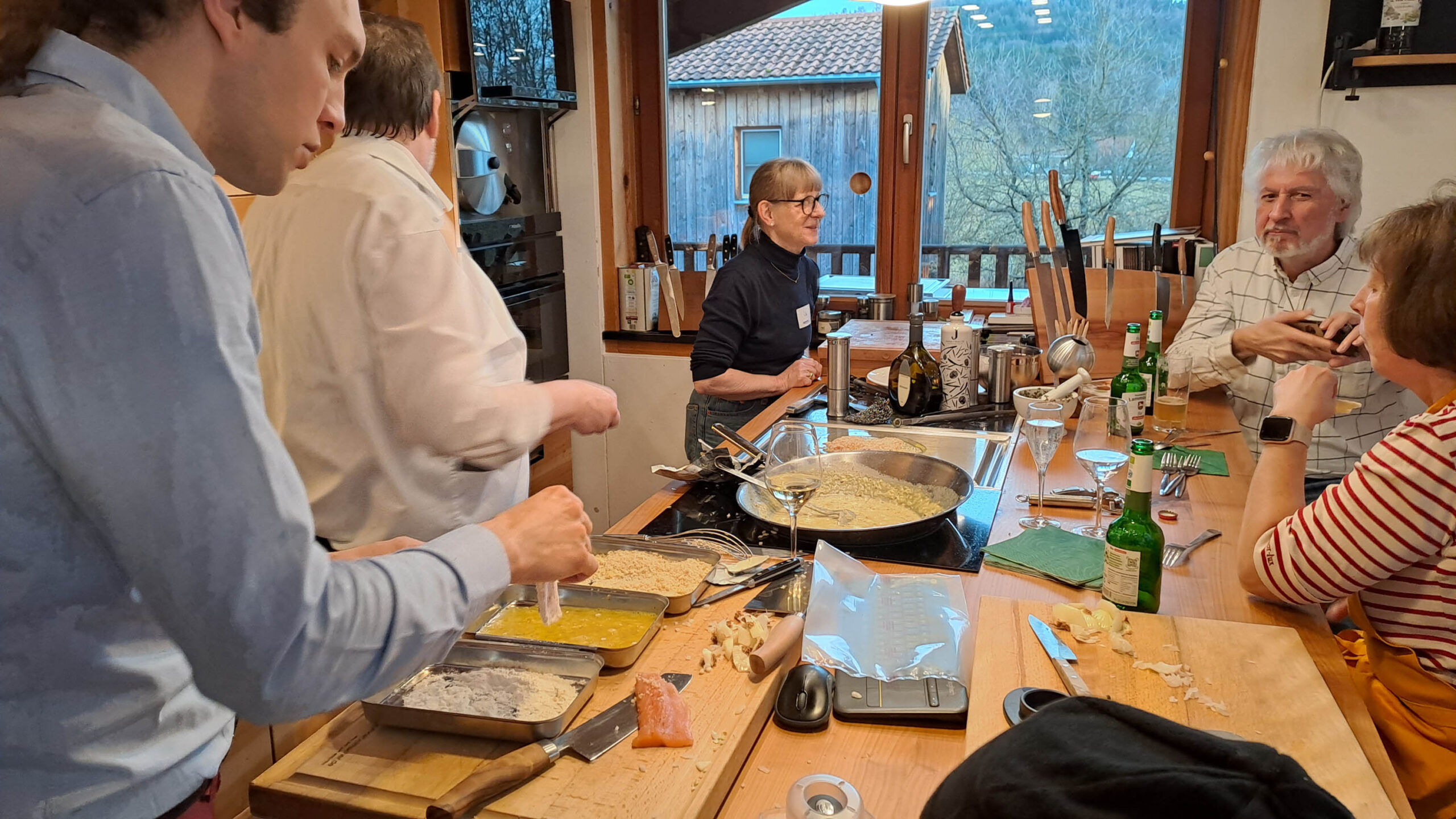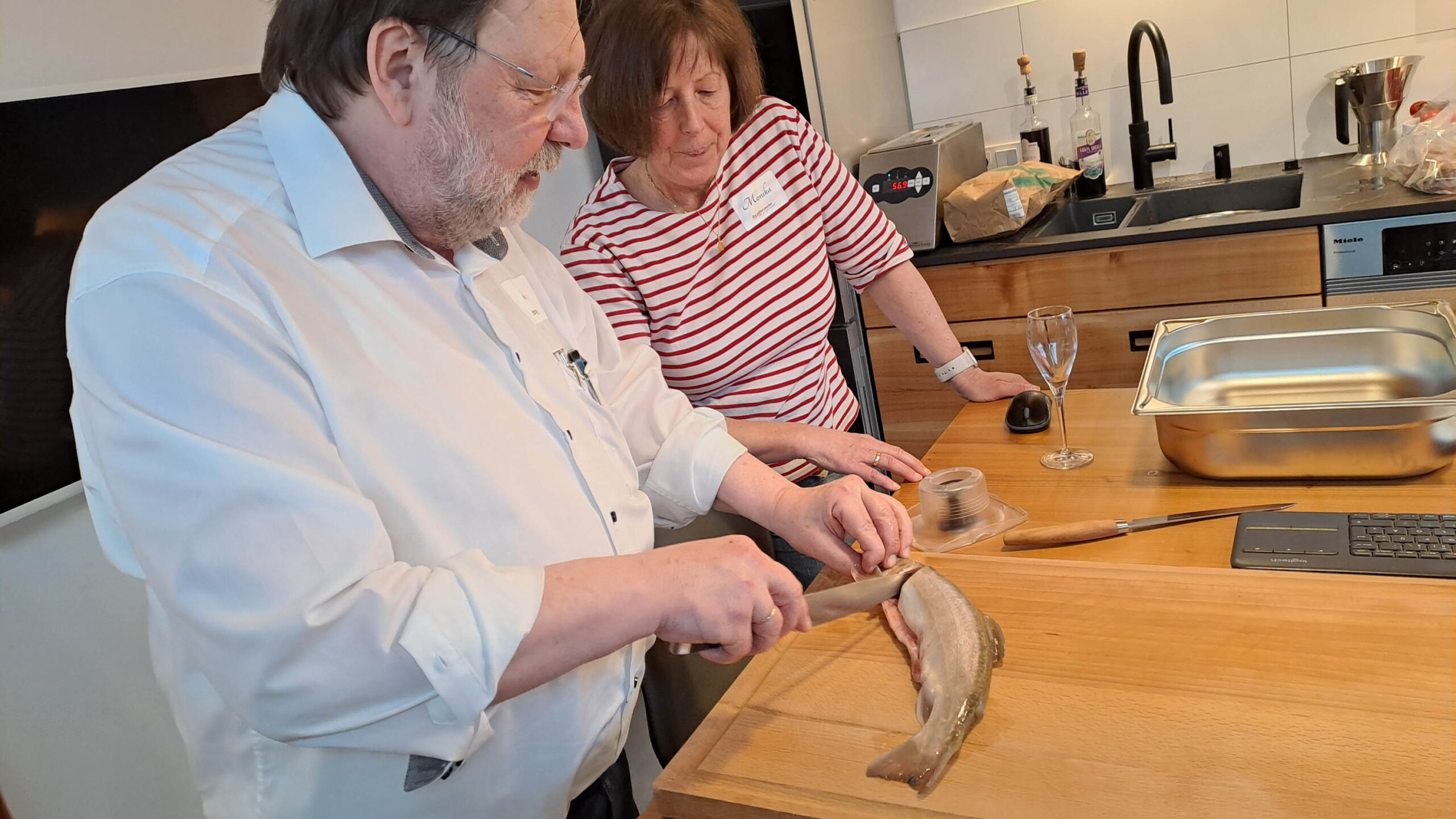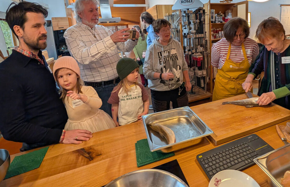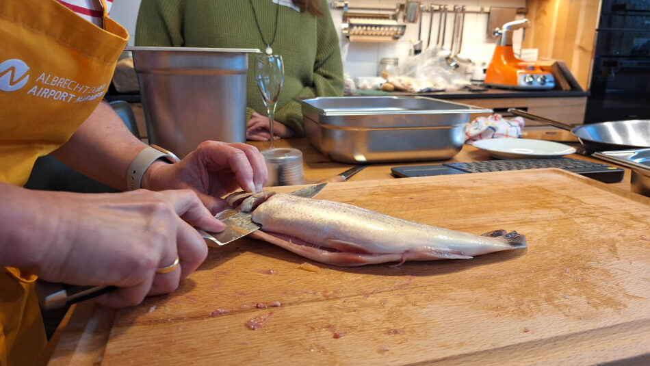 Das Filetieren von Fischen, bei uns waren es Saiblinge, ist nicht sooo einfach nachzumachen, wie es auf den Videos immer aussieht, weshalb wir uns dafür viel Zeit nahmen und auch Fische mit nach Hause gaben (am liebsten mit einem Filetiermesser von uns). Auf dass zu Hause weiter geübt werden kann. Nur die Übung führt irgendwann mal zu Filetierzeiten von nichtmal zwei Minuten pro Fisch. Der Fisch im Ganzen ist deutlich günstiger, als das Filet und aus den Karkassen kann man köstlichen Fond für die Saucen herstellen, also macht das Ganze noch mehr Sinn.