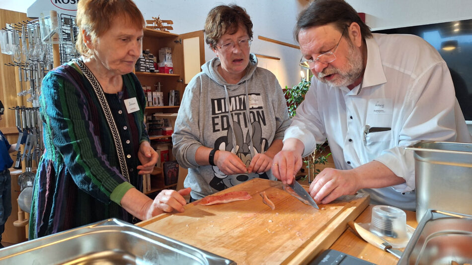 Kochen ist zu einem großen Teil Handwerk und das wiederum besteht zu einem großen Teil aus Schneidtechnik. Schon vor der Ausbildung zum geprüften Ernährungsexperten durften wir seit dem Jahr 2000 mit fränkischen Spitzenköchen gemeinsam kochen und wir freuen uns riesig, wenn unsere Kunden unser Kursangebot annehmen und danach auch noch fleißig üben. Denn gerade beim Filetieren von Fisch, Rehrücken oder Orangen macht mal wieder die Übung die Meisterin.