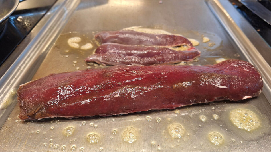 Eine Hälfte haben wir Sous Vide gegart (60 Grad, 30 Minuten) und anschließend gebraten, die andere am Tepan angebraten und im Teller-Wärmeschrank gargezogen.
