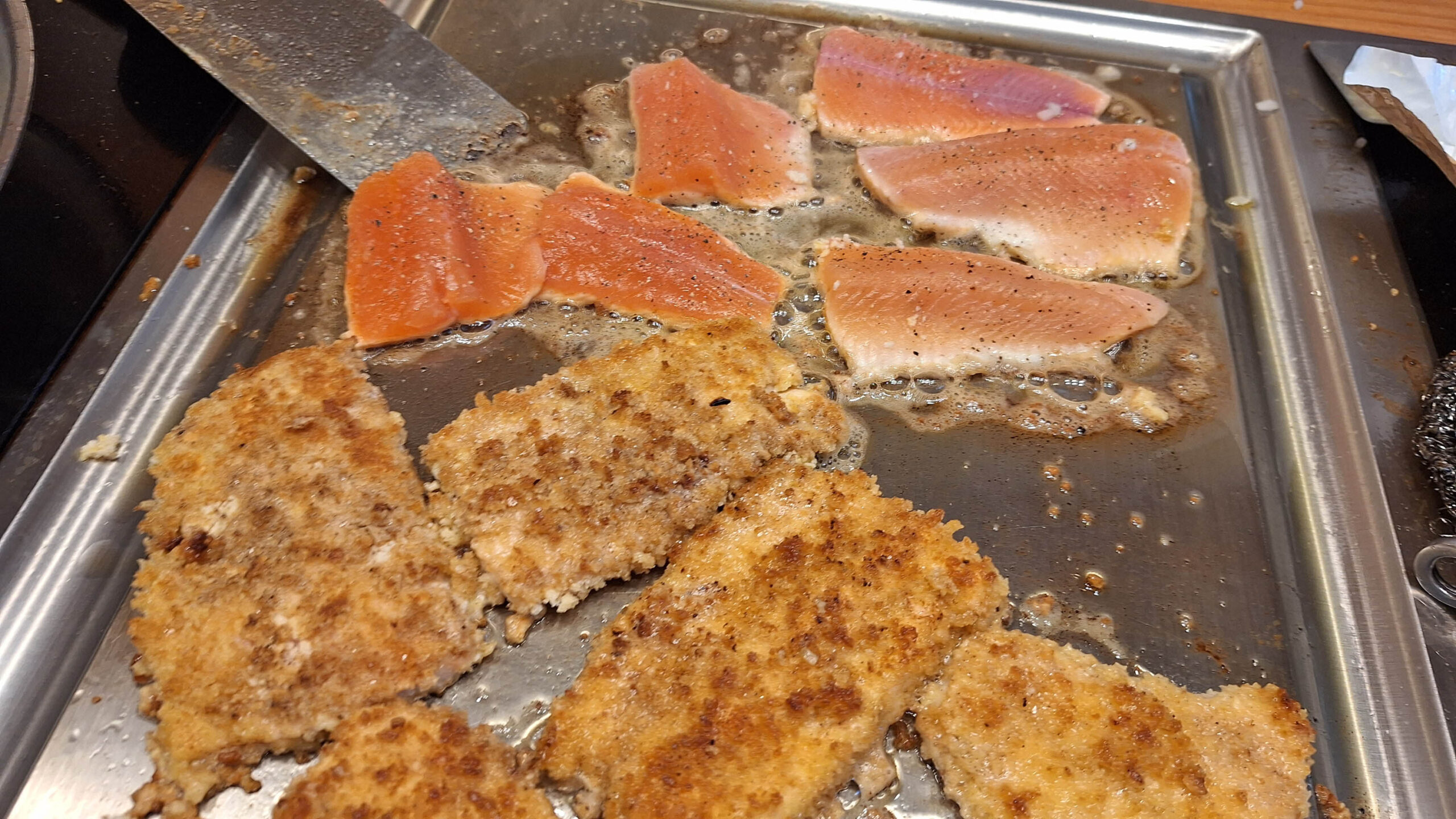 Die Verwendung des groben Panko-Paniermehls haben wir dereinst von Denis Scheck abgeschaut, in der Zwischenzeit kann man es bei uns auch ganz normal aus Deutschland im Supermarkt kaufen. Es ist gröber, als die Semmelbrösel und macht das Panierte deutlich knuspriger.