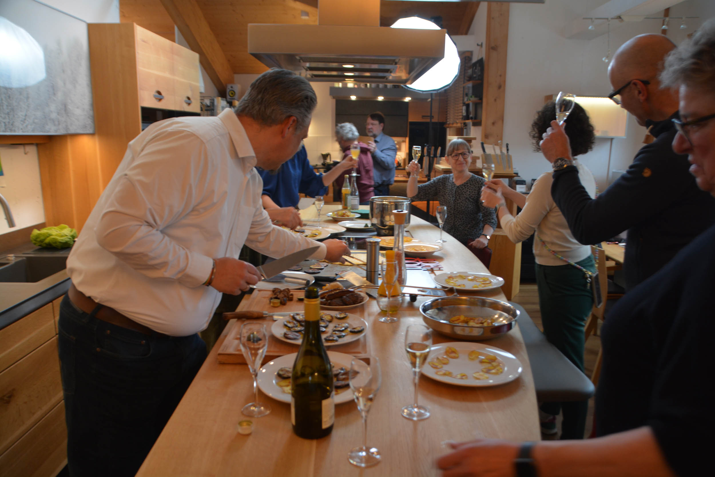 Im regionalen Musterhaus verquasselten wir uns ein wenig, denn für Peter Kölbl und seine Frau Claudia hatte hier einst alles begonnen. Ihr eigenes Haus sieht zwar anders aus, basiert aber auf denselben Ideen: Ein komplettes Holzhaus aus regionalem Material, errichtet von Handwerkern aus der direkten Nachbarschaft. Besonders beeindruckt waren unsere Gäste davon, dass man unserer Küche im Musterhaus ihre 25 Jahre überhaupt nicht ansieht. Das funktioniert nur mit der Kombination aus massivem Holz, Keramik, Edelstahl und einem Team, welches auch das Nachölen von Holzoberflächen und alle anderen Tricks zum Jungbleiben von Möbeln beherrscht.
