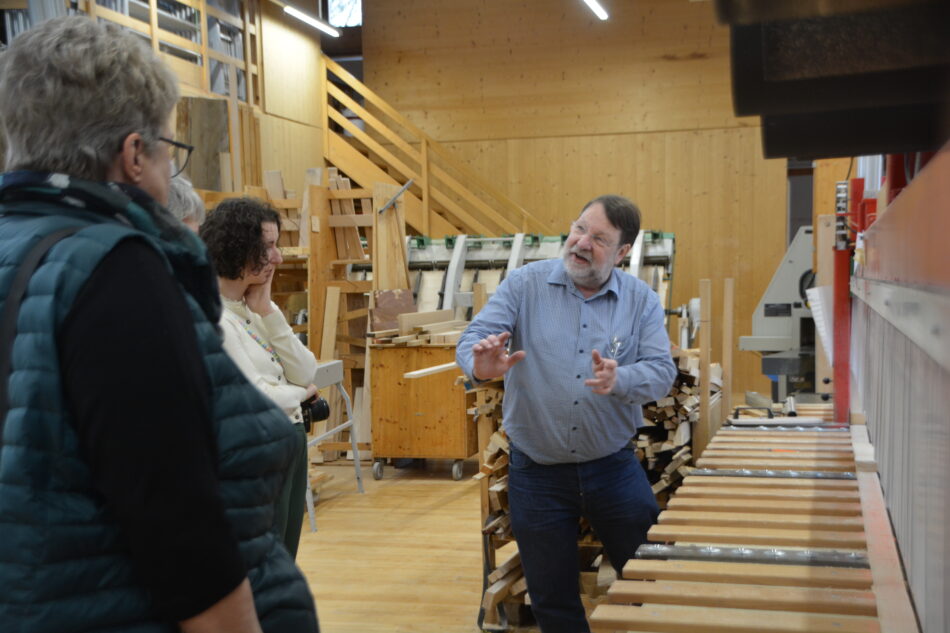 Unsere Gäste kamen beinahe pünktlich, aber dann starteten wir direkt in die bekannte Runde der regionalen Waldschöpfungskette. Von den mächtigen Holzstapeln vor und in der Schreinerei – die übrigens zur schönsten Werkstatt Deutschlands gewählt wurde – ging es am Holzlager vorbei durch die gesamte Fertigung, sogar mit Inbetirebnahme der rückenschonenden Längsschnittsäge. Ziel einer solchen Betriebsverführung ist es immer, unsere Alleinstellungsmerkmale erlebbar zu machen, die wir vor kurzem auf einer neuen Seite zusammenfassten..