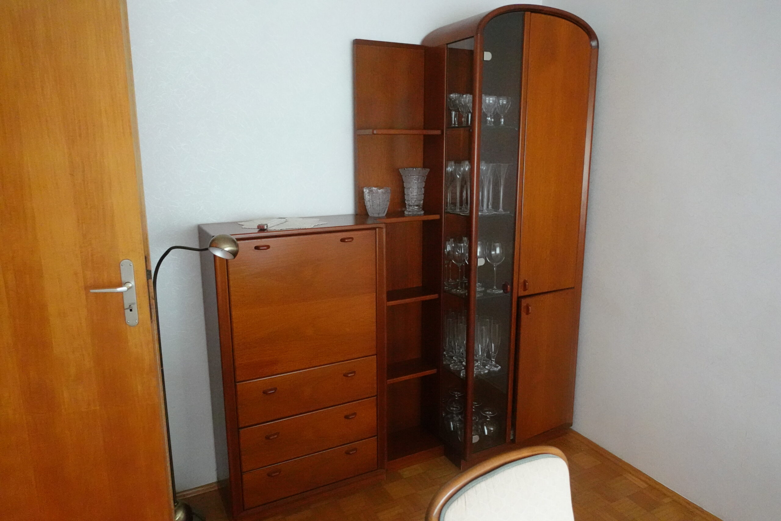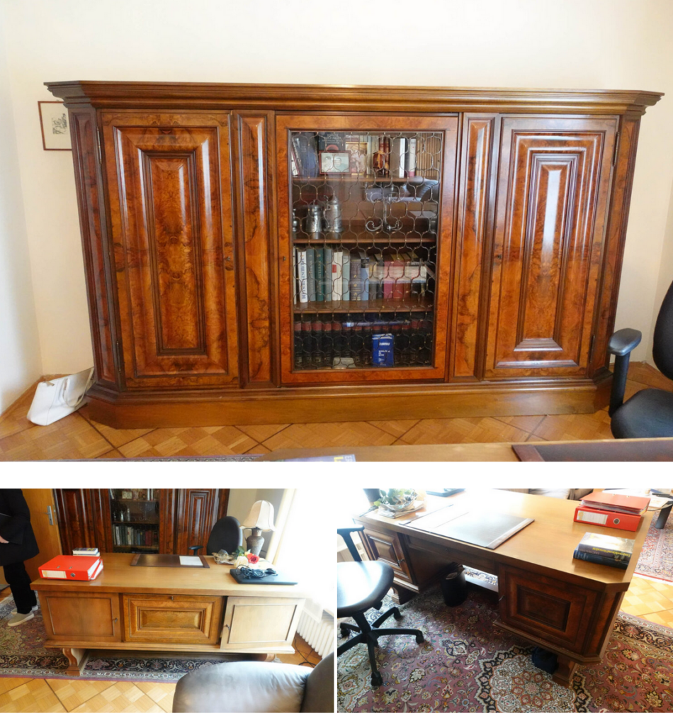 Die wertvollsten Möbel, nicht in Geld, sondern in Arbeitszeit und Stil, sind gegen Spende zu haben. Es sind dieser Schreibtisch mit Schrankwand in Nussbaum Wurzelmaser, die wir am liebsten zusammen abgeben würden, man kann aber auch nur den Schrank einzeln wählen.