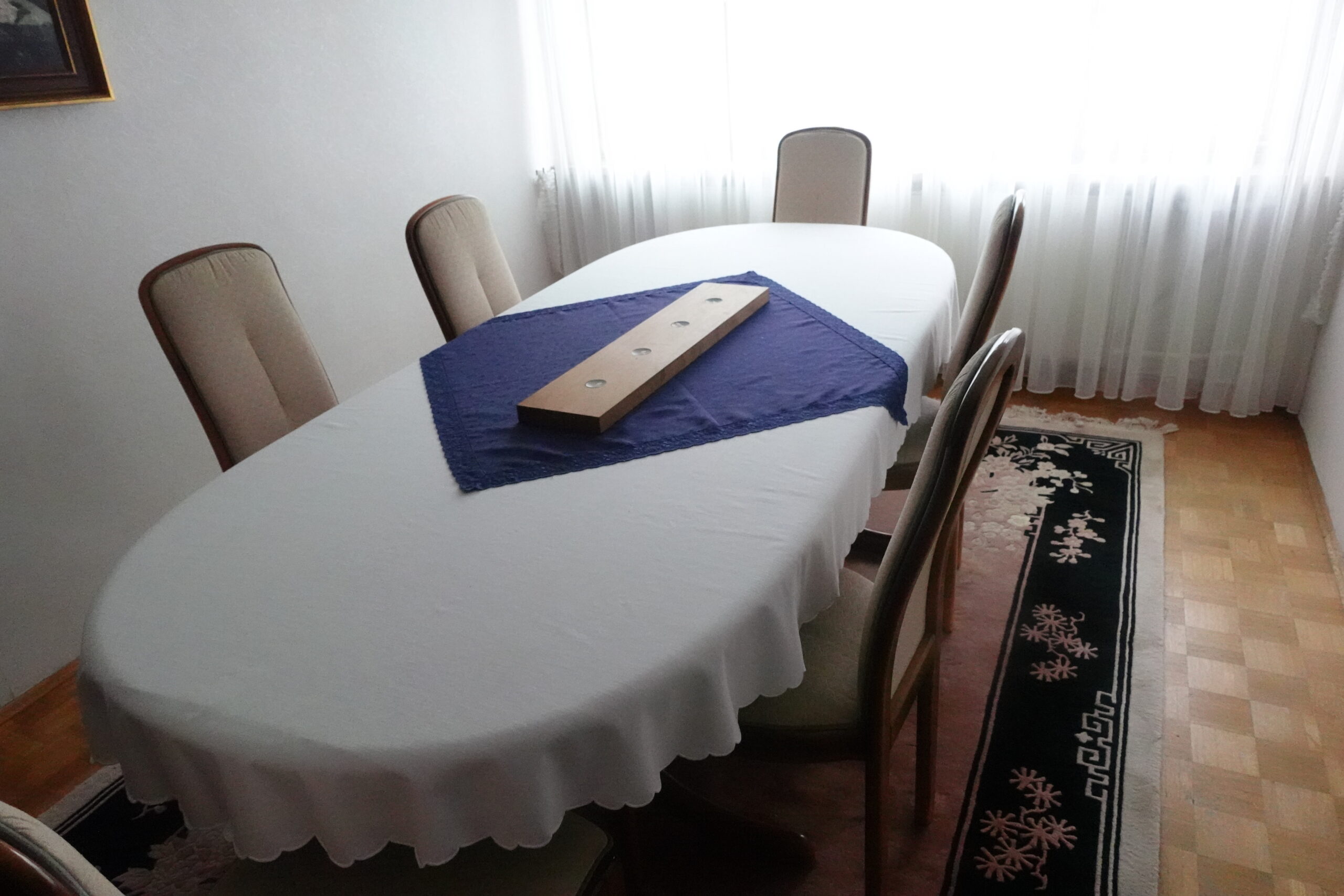 Dieses komplette Esszimmer in Kirschbaum-Furnier hat auch einen Ausziehtisch mit Einlegeplatten, die in meinem Leben aber nie rausgenommen wurden, das ist übrigens bei den meisten Ausziehtischen so.