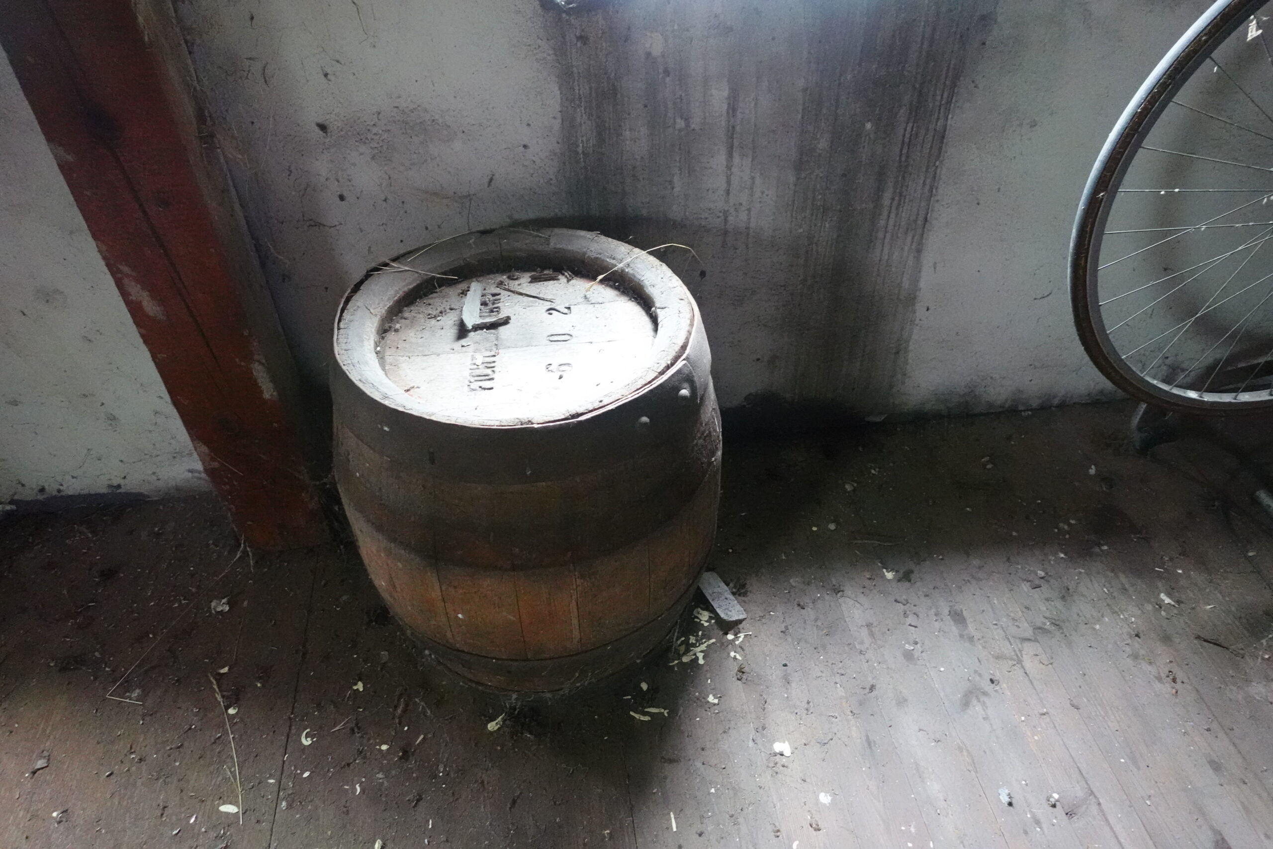8. Glastisch, Edelstahlarbeitsplatte, Kisten, Fass und Fahrrad