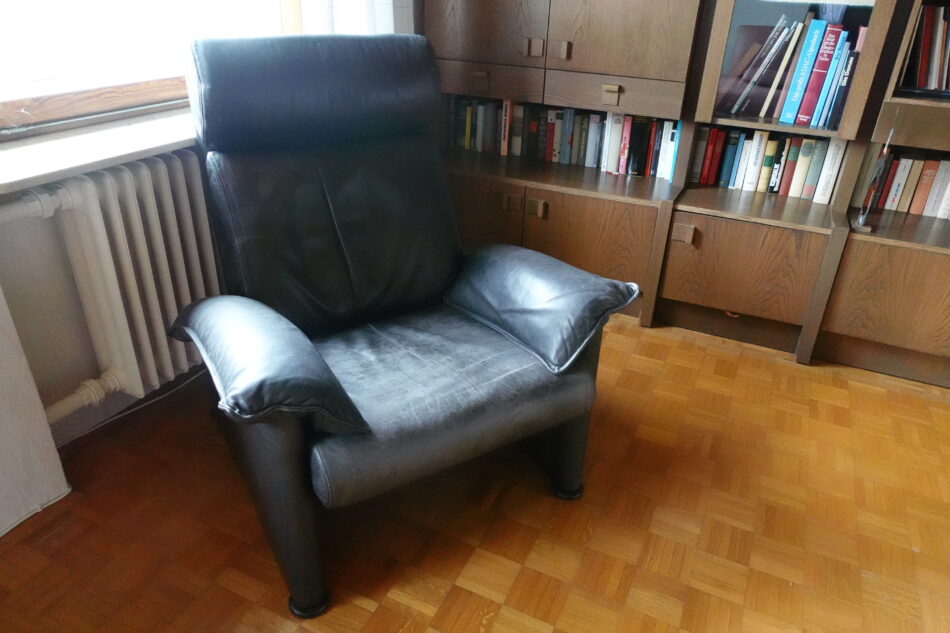 Von unserem ersten Polstermöbellieferanten Intertime ist noch der Sessel mit Hocker in schwarz übrig. Diese Model haben wir 1991 mit Kirsten Oggesen fotografiert.