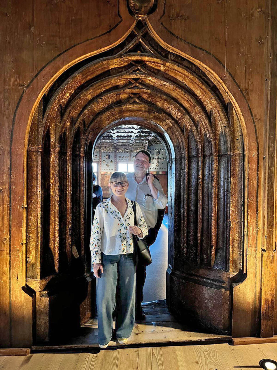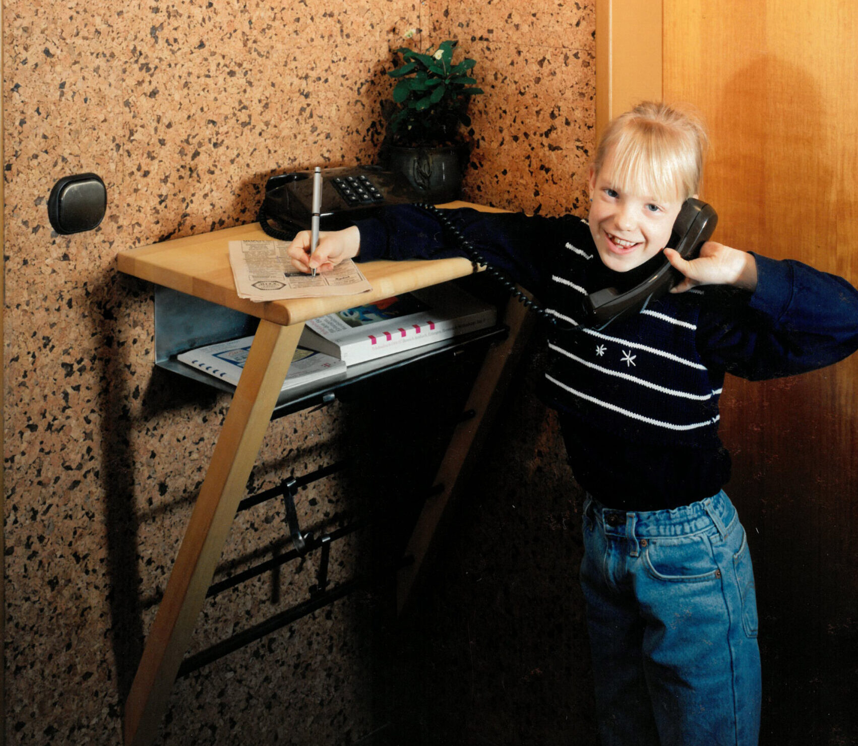 Das wandhängende Telefonpult aus der Möbelmacherwerkstatt ist aus Ahorn mit schwarzen Leitersprossen, an denen S-Haken das Abhängen ermöglichen. Im Vergleich zu Laura hat es sich in 30 Jahren kaum verändert.