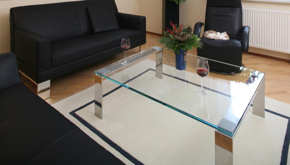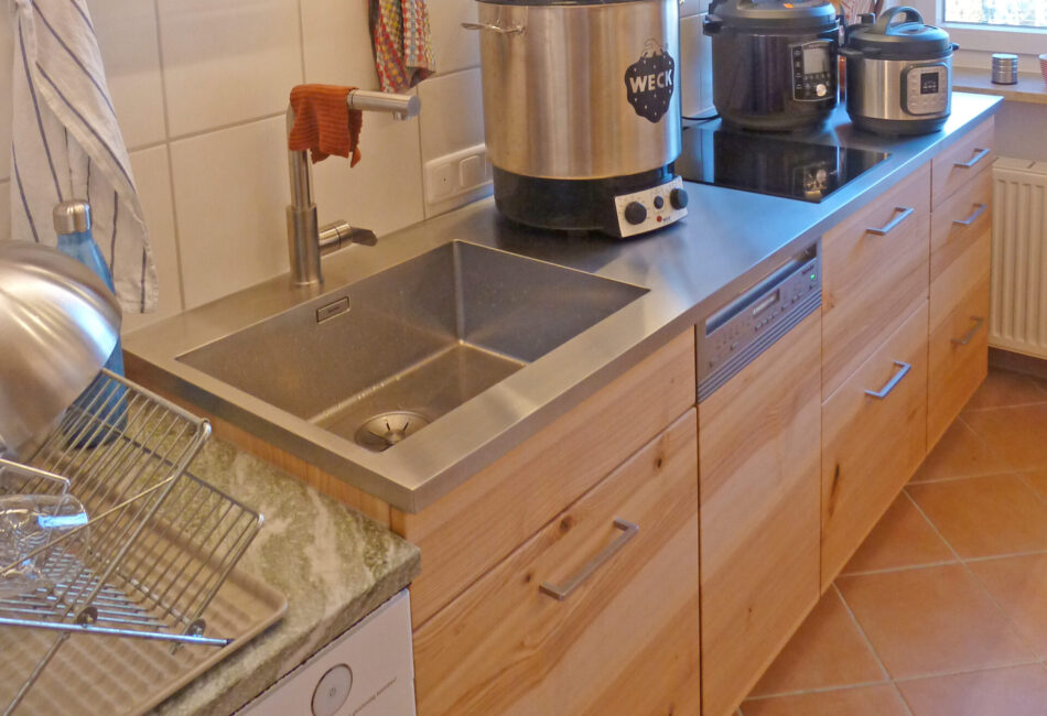 Es gibt noch einen Glascouchtisch in Kirschbaum mit Schönheitsfehlern aber auch eine übrige Küchenarbeitsplatte aus Edelstahl.
