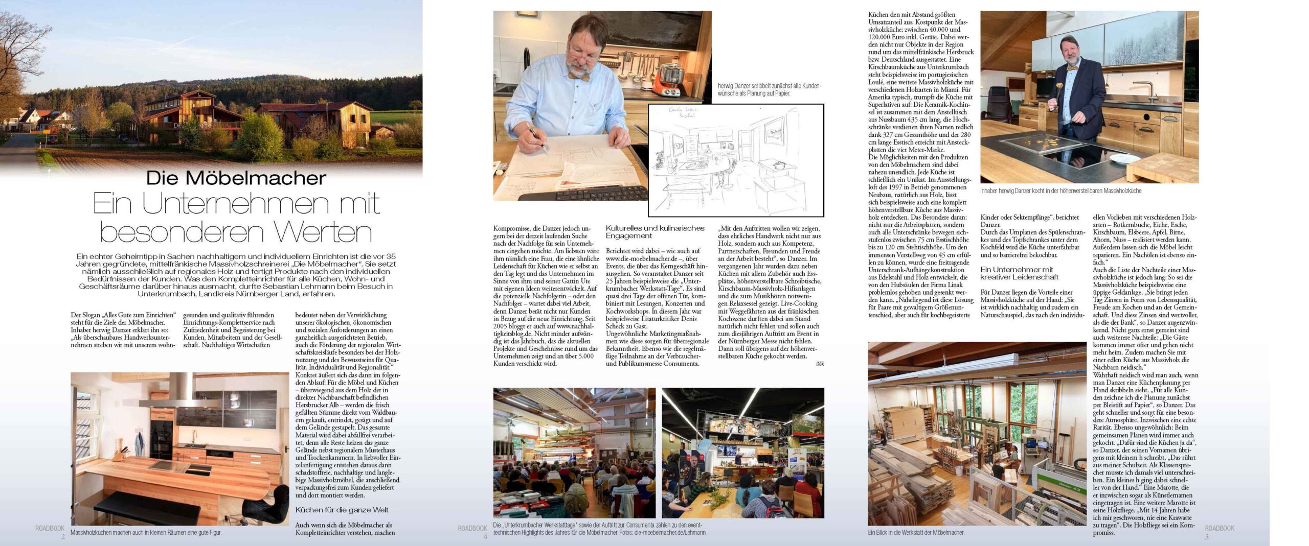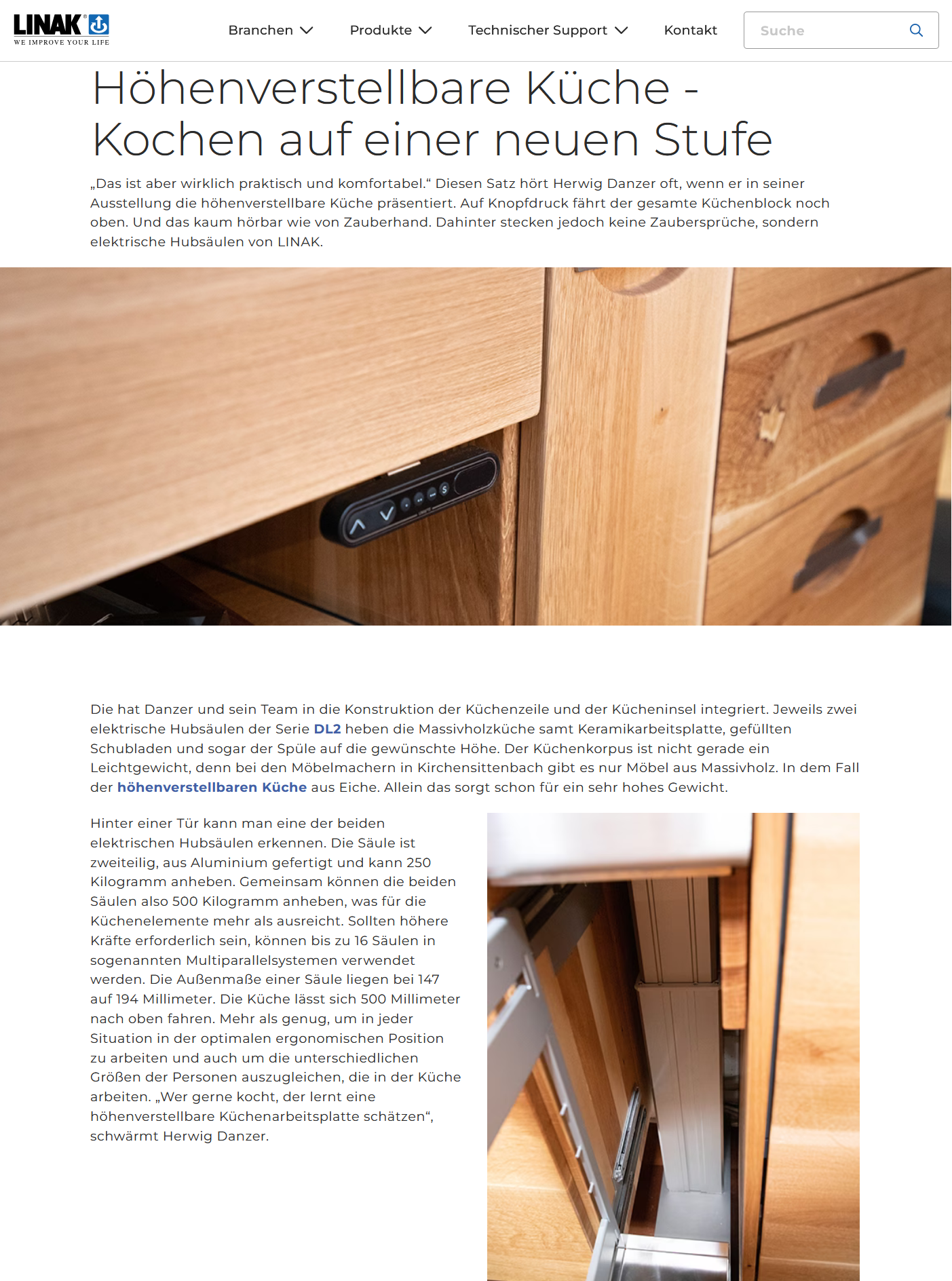 Außerdem ist auch die Spülenzeile höhenverstellbar und bei uns geht es nicht nur um die Umstellung auf Partyhöhe zum Sektschlürfen, sondern ursprünglich um Rollstuhlfahrerinnen. Denn sie kann zwischen 75 cm normaler Tischhöhe mitsamt allen Schränken auf 120 cm Stehtischhöhe stufenlos verstellt werden. Also habe ich dem Redakteur Sebastian Lehmann den Link geschickt und in der übernächsten Ausgabe wurde der Artikel über unsere höhenverstellbare Küche und unsere Arbeit überhaupt zum ersten Mal in einer Fachzeitschrift veröffentlicht. Dort finden kleine Schreinereien sonst nie eine Erwähnung.