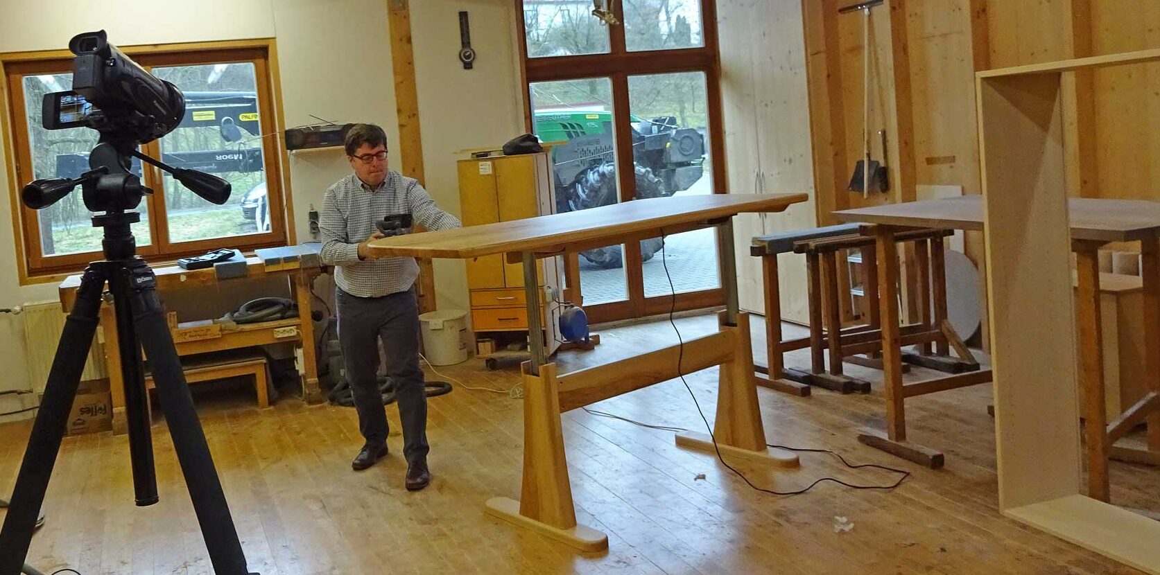 Mein eigener Schreibtisch fährt seit 1997 dank eines LINAK-Gestells bis heute mühelos rauf und runter, auch für viele Kunden haben wir seit dieser Zeit unterschiedlichste höhenverstellbare Schreibtische in Einzelanfertigung verwirklicht. Eine Yogalehrerin wollte 2019 aber einen Schreibtisch, dem man die benötigten Metallteile nicht ansieht, weil die Kursteilnehmer den Schreibtisch auch rücklings von unten sehen werden.