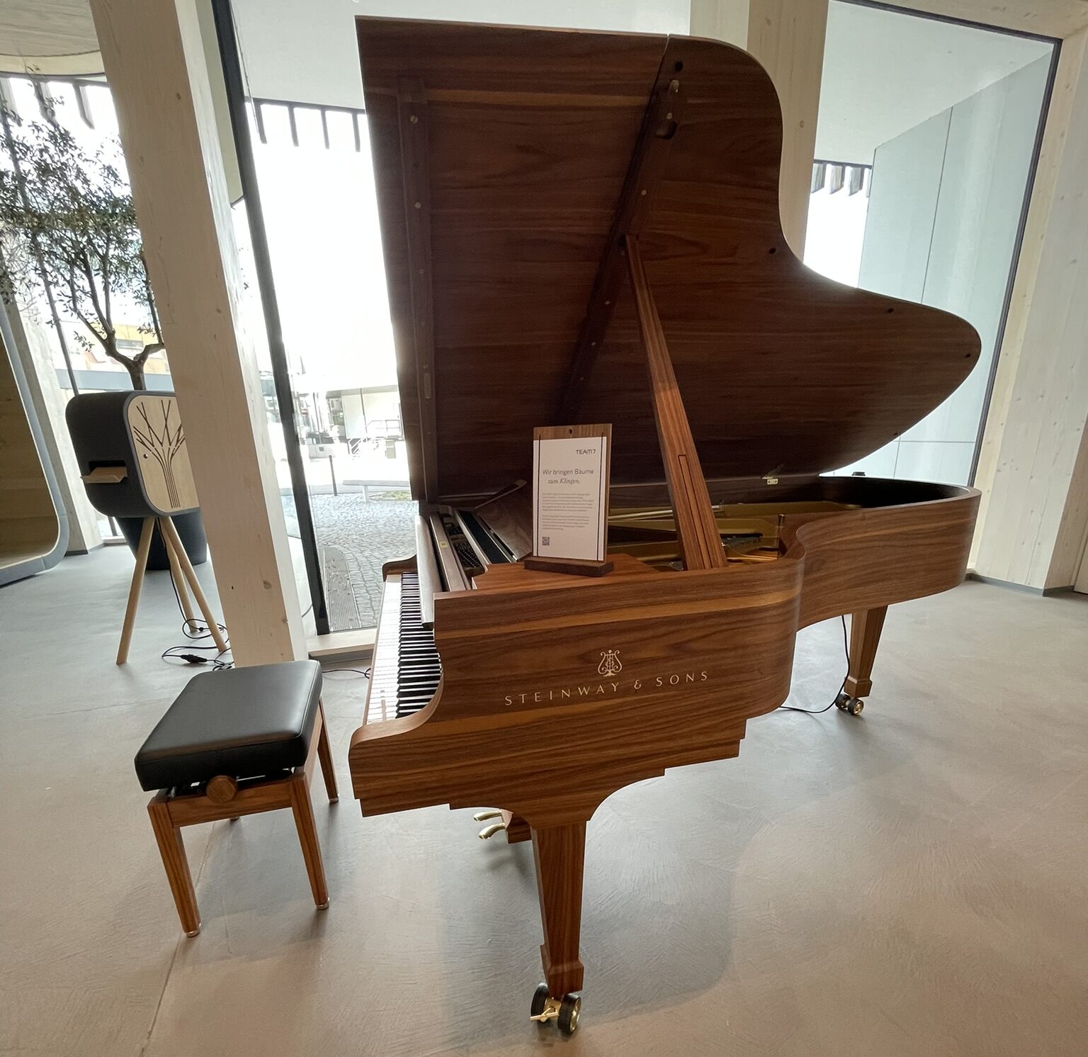 Die Eingangshalle ist ebenso einladend wie riesig, dahinter das Restaurant, und in derselben steht der Team7-Steinwayflügel, von dem es nur sieben Stück gibt und für den sie die Furniere liefern durften (aus 18 Lagen mit 4 mm dicken Ahorn-Furnieren besteht so ein Rim (Korpus) im unteren Bereich meist).