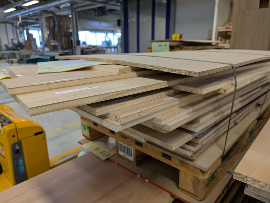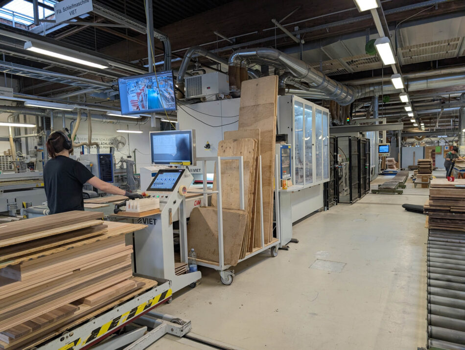 Nun ja, die Führung durch einen engagierten Mitarbeiter, der seit 20 Jahren dabei ist, lässt sich zusammenfassen in: „Genauso wie bei uns, nur viel, viel größer.“ Sogar die CNC kommt vom gleichen Hersteller, nur ist auch sie viel größer. Denn in der Tat müssen alle Hersteller von Massivholzmöbeln mit ganz anderen Dingen umgehen können, als das die Spanplattenverarbeiter tun. Die Luftfeuchtigkeit sollte konstant bleiben, damit die Möbelelemente nicht größer oder kleiner werden. Die Oberflächenbearbeitung mit Ölen ist deutlich aufwändiger und benötigt viel mehr Zeit und Fläche zum Trocknen, Fronten und Platten müssen so stabilisiert werden, dass sie auch bei wechselnden Klimabedingungen und natürlich auch der Klimakrise nicht krumm werden.