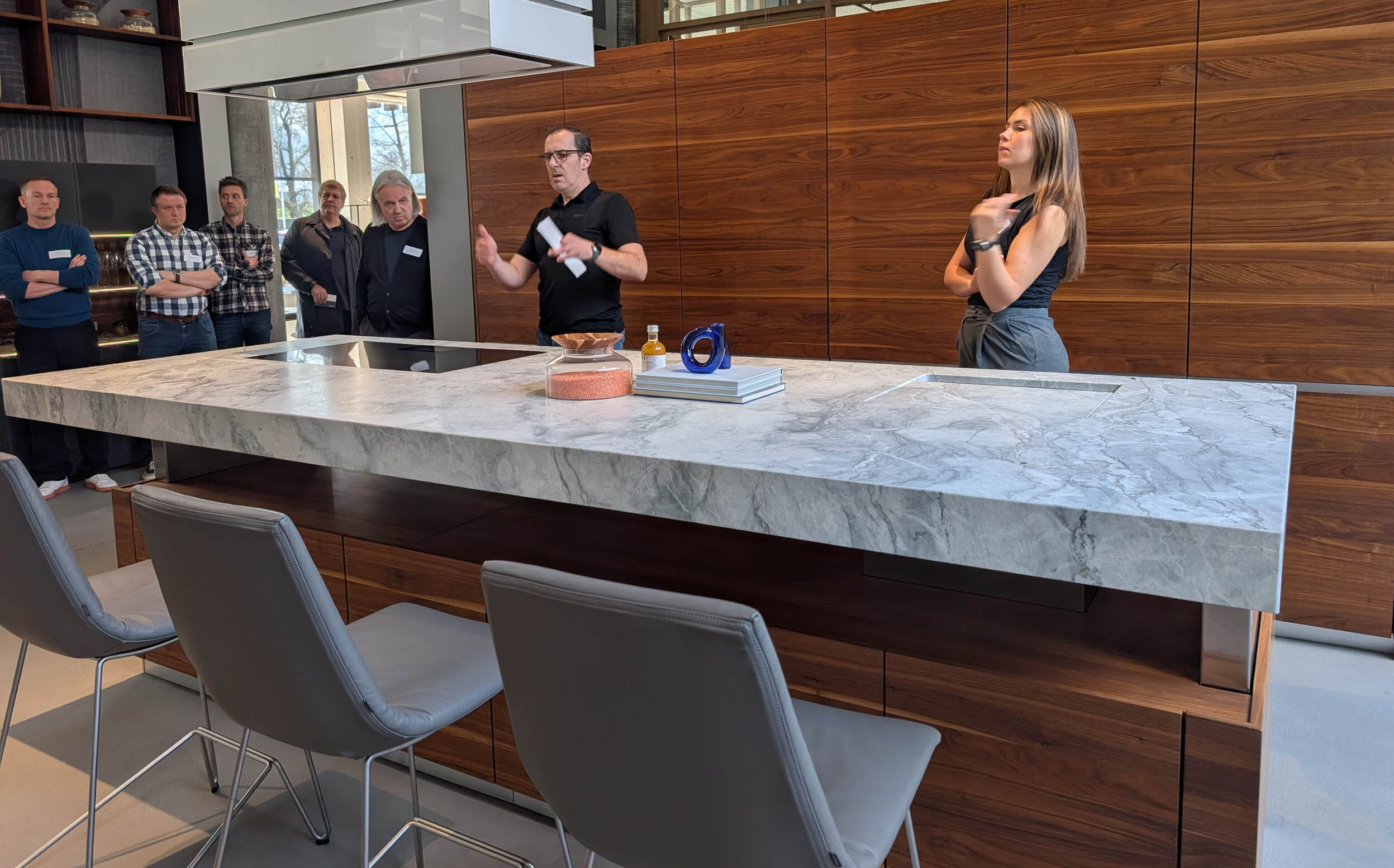 Der Showroom ist im ersten und zweiten Stock, einen Stock drüber ist der Seminarraum mit den ziemlich großen Showküchen. Dort angekommen gab es feine Getränke und auch was zu Essen, und wir konnten dank Namensschildern erkennen, wer zu LINAK oder den anderen Firmen gehörte. Wir waren das einzige Ehepaar, das lag daran, dass wir den Termin noch mit anderen verbinden konnten, aber es war auch insofern gut, weil die drei folgenden Vorträge uns ganz unterschiedlich ansprachen.