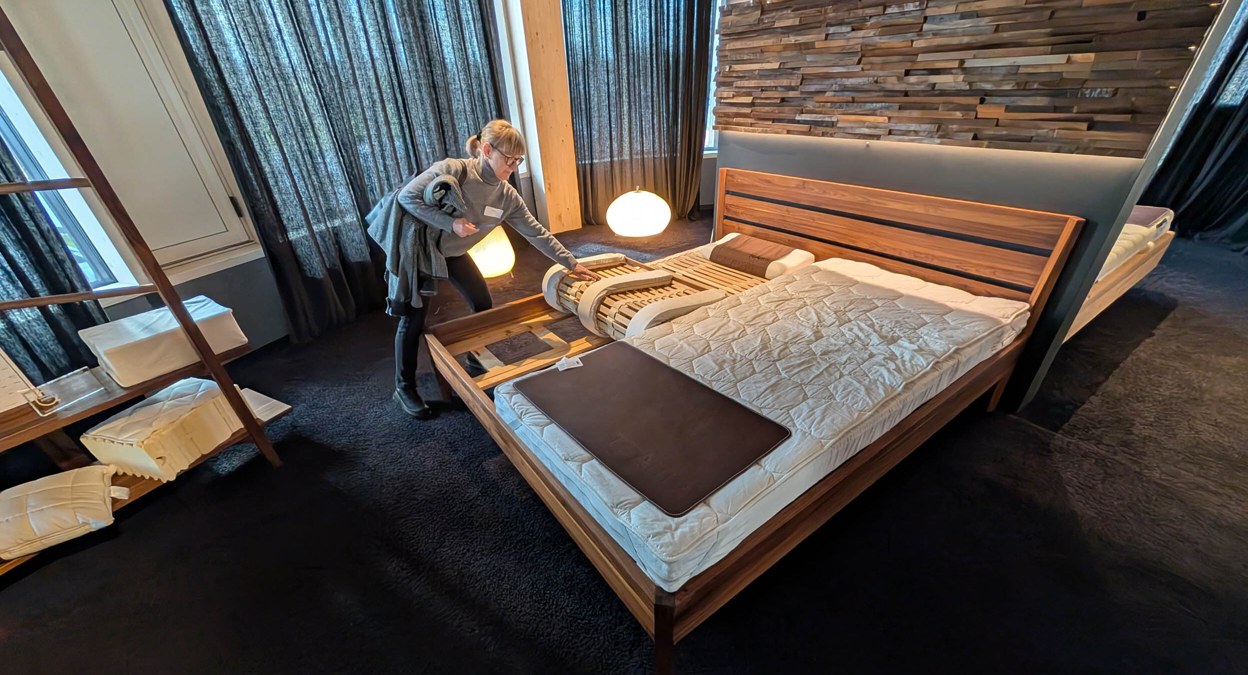 Im Store gab es einen ziemlich raffinierten höhenverstellbaren Schreibtisch (allerdings ohne Bleistiftrunterrollschutzkante, wie wir sie bauen), einen geschickt versteckten Arbeitsplatz und einen elektrisch höhenverstellbaren Couchtisch mit Linak-Säulen zu besichtigen. Ute (ihres Zeichens Trägerin des Innovationspreises Ergonomie für ihr ergonomisches Lebenswerk) hat sich natürlich auch für die Bettsysteme interessiert, die Erwin Berghammer im letzten Jahrtausend noch bei unserem Hersteller ProNatura zukaufte, daher auch die Freundschaft. In der Zwischenzeit stellen sie aber eine etwas abgespeckte Version selbst her. Das ist dann zwar nicht so vielseitig verstellbar, bedeutet aber auch weniger Beratungsaufwand.