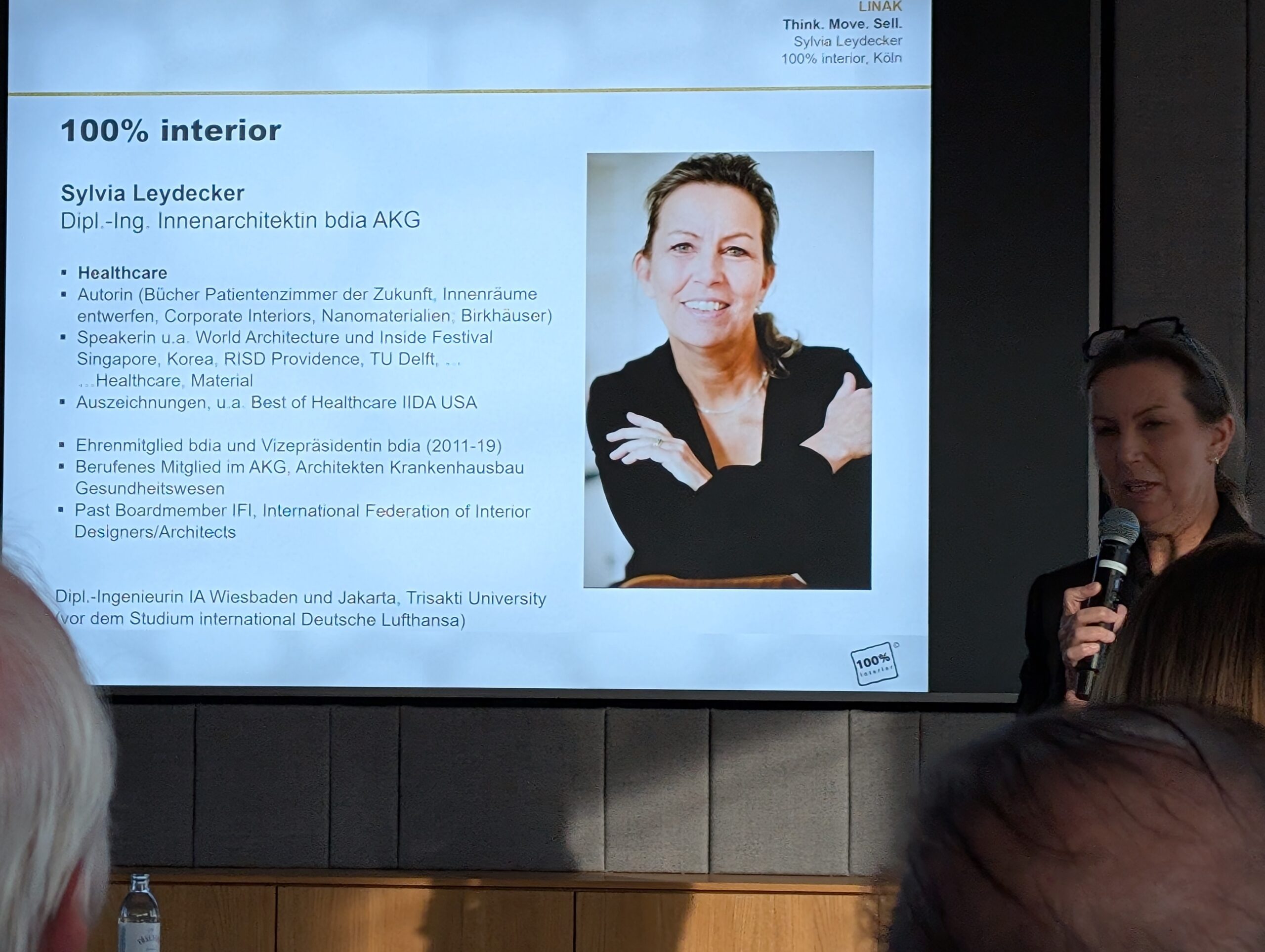 Sylvia Leydecker aus Köln fokussierte ihren Vortrag auf das Thema Healthcare, also auf die Einrichtung von Krankenhäusern mit Schwerpunkt auf den Räumen für Privatpatienten. Zusammen mit ihrer Lebensgeschichte – nicht zuletzt als Stewardess – war das hochinteressant und anschaulich bebildert, aber natürlich auch kein Bereich, der für Massivholz prädestiniert wäre. Dafür haben wir jetzt einen kleinen Eindruck, wie Entscheidungen in den großen Kliniken getroffen werden und wie selten das mit objektiv begründbaren Argumenten zusammenhängt.