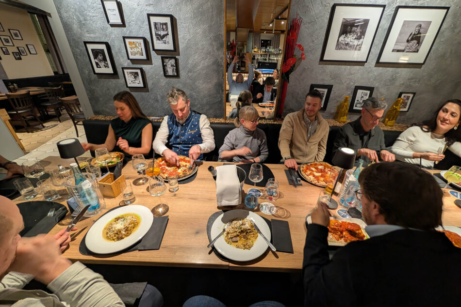 Also haben wir uns dem kulinarisch Italienischen hingewendet und dabei erkannt, dass wir nicht in einer normalen Pizzeria gelandet sind, sondern bei einem stolzen Vertreter der echten italienischen Küche namens da Mimmo, welches wir nur empfehlen können. Schon unsere Vorspeise Bruschetta war viel köstlicher als sonst, aber nach dem Eintreffen der anderen Gäste wurde alles noch viel besser. Christine hatte nämlich die Idee, für alle 13 Gäste gemeinsam eine gemischte Vorspeise zu bestellen, und das war fast die beste Entscheidung des Tages: Von den Miesmuscheln über die Wurst mit Käse zum panierten Fisch, Thunfisch-Carpaccio, Petersiliencreme mit Sardellen und natürlich kleinen Pizzen waren alle Speisen grandios. Später auch die Hauptspeisen. Für Christian und mich besorgte der Chef sogar noch einen besonderen Primitivo aus dem Keller, und die sechs Mitarbeiter von LINAK, Freelancer Tobi als Social-Media-Mann, die drei Referenten, der Designer und wir vier Möbler, also alle 13 Gäste, waren vom Service und der Atmosphäre begeistert.