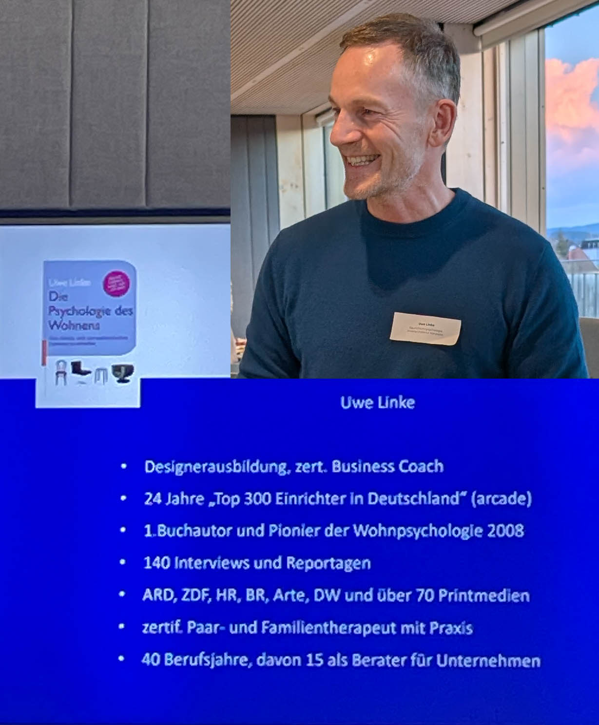 Uwe Linke eröffnete uns neue Einsichten in die Wohnpsychologie, mit der er sich seit vielen Jahren als Erster beschäftigte nach dem Motto: Sag mir, wie Du wohnst, und ich sag Dir, wer Du bist. Er bot ganz viele spannende Einblicke, wie unser Gehirn den Körper steuert, aber auch welche Auswirkungen die Einrichtung auf die Psyche hat und andersrum. Wir fühlten uns mit unserer Einrichtungsarbeit seit 38 Jahren durchgängig bestätigt und waren von seinen besonderen Fähigkeiten sehr beeindruckt.