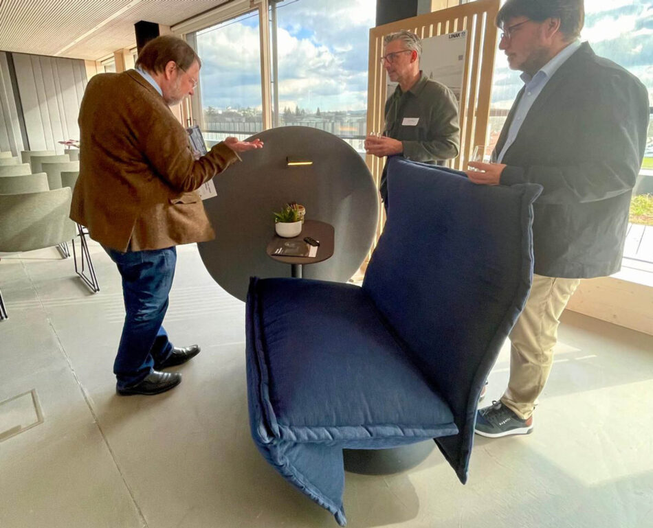 Einer der Gründe, warum wir die Reise angetreten haben, war die Hoffnung, dass wir diese Möbel aufschrauben, auseinandernehmen und uns zusammen tief in die Technik einarbeiten – aber so weit kam es leider nicht. Durch den zusätzlichen Vortrag und den vorigen temporal überzogenen wurde die Zeit etwas eng, und die LINAK-Idee der Veranstaltung war wohl eher, dass die anwesenden Firmenchefs einen inspirierenden Tag haben und ihre Designer jetzt beauftragen, mal was mit Höhenverstellung zu machen?