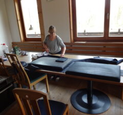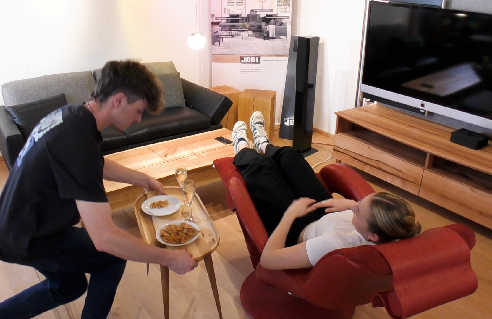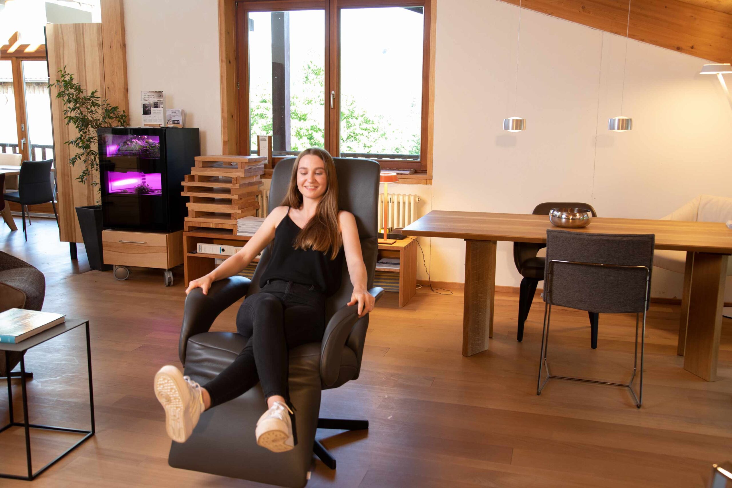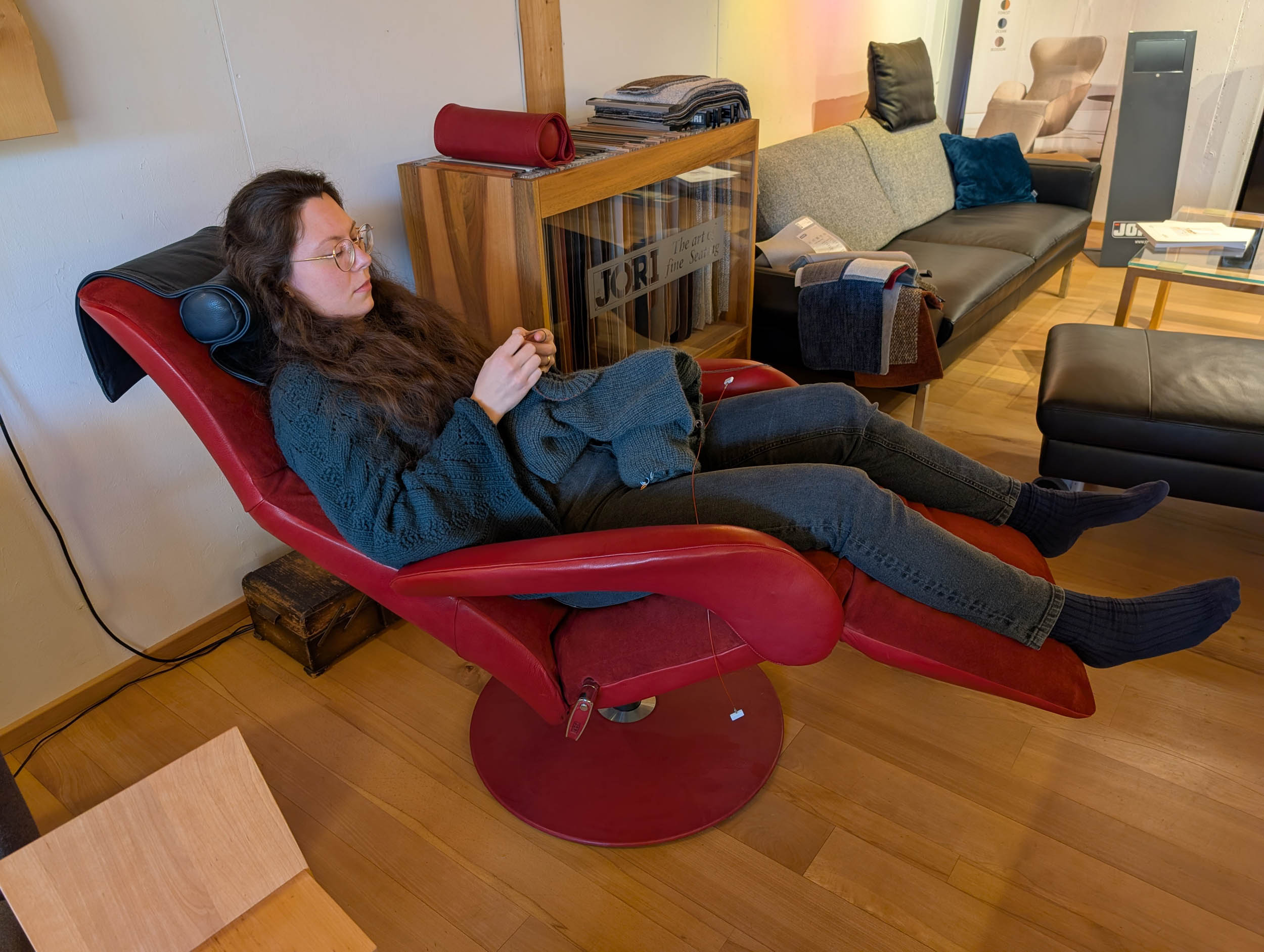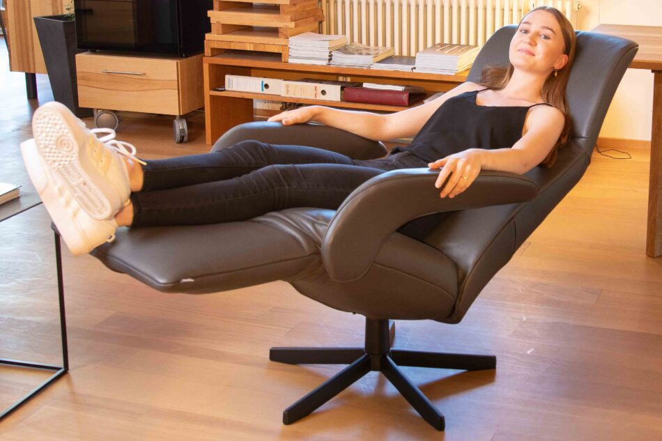 Wichtig ist, dass alle Relaxsessel in der Ausstellung oder zuhause immer eine gelöste Bremse haben. Nichts ist schlimmer, als wenn man sie wie gewohnt genüsslich reinfallen lässt und die Bremse verhindert das Zurückgleiten. Denn das Schönste beim Hinsetzen ist der sanfte Schwung nach hinten, der einen kleinen Vorgeschmack auf den bevorstehenden Sitzkomfort gibt. Die unterschiedlichen Sesselmodelle haben auch minimale Unterschiede in der Balance (es geht leichter oder schwerer, in die Liegeposition zu kommen), die die meisten Menschen beim „Schnell-mal-Reinhocken“ nicht erfühlen; Laura war sich dessen aber sehr bewusst und hat damit ihre sorgfältige Auswahl gestartet.